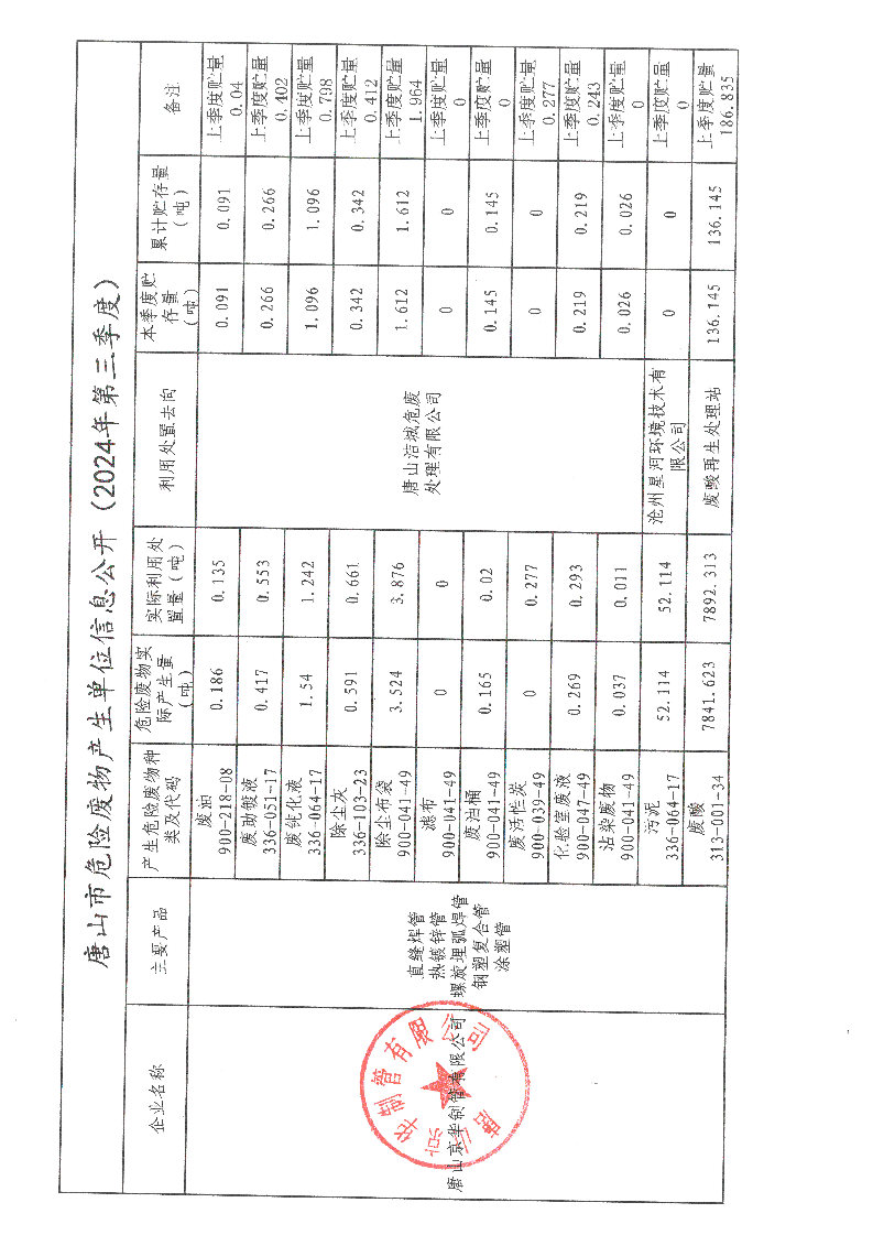 唐山京華制管有限公司2024年第三季度信息公開