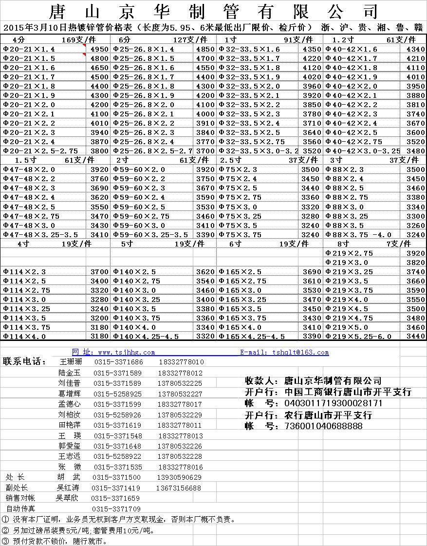 唐山京華2015年3月10日熱鍍鋅管價(jià)格表(長度為5.95、6米最低出廠限價(jià)、檢斤價(jià)) 浙、滬、貴、湘、魯、贛