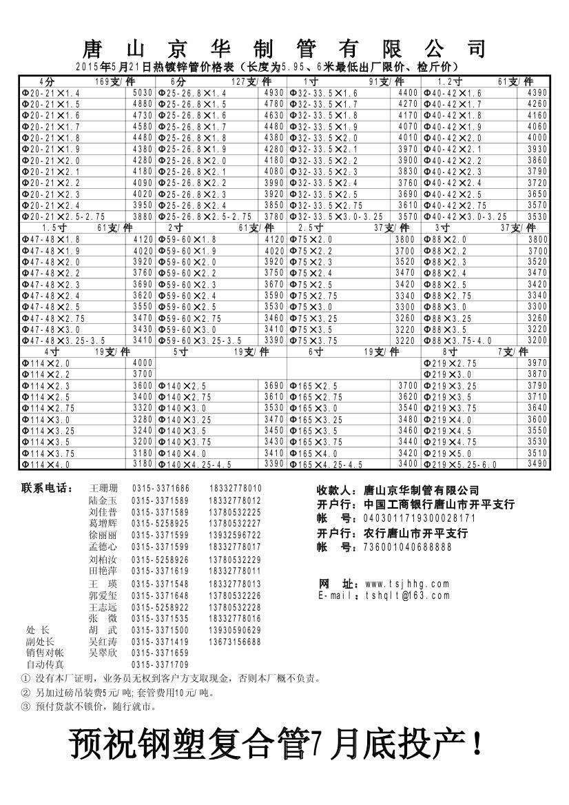 唐山京華2015年5月21日焊管價(jià)格表(長(zhǎng)度為5.95、6米最低出廠限價(jià)、檢斤價(jià))