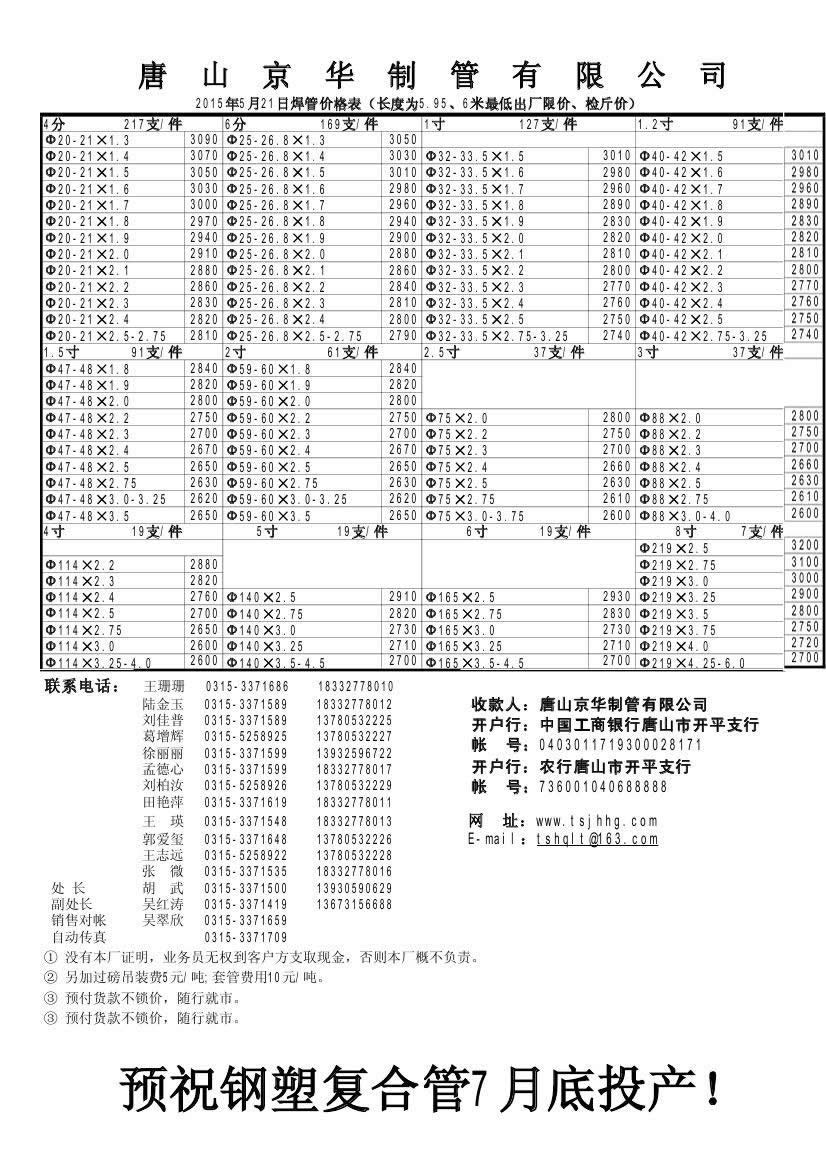 唐山京華2015年5月21日焊管價格表(長度為5.95、6米最低出廠限價、檢斤價)