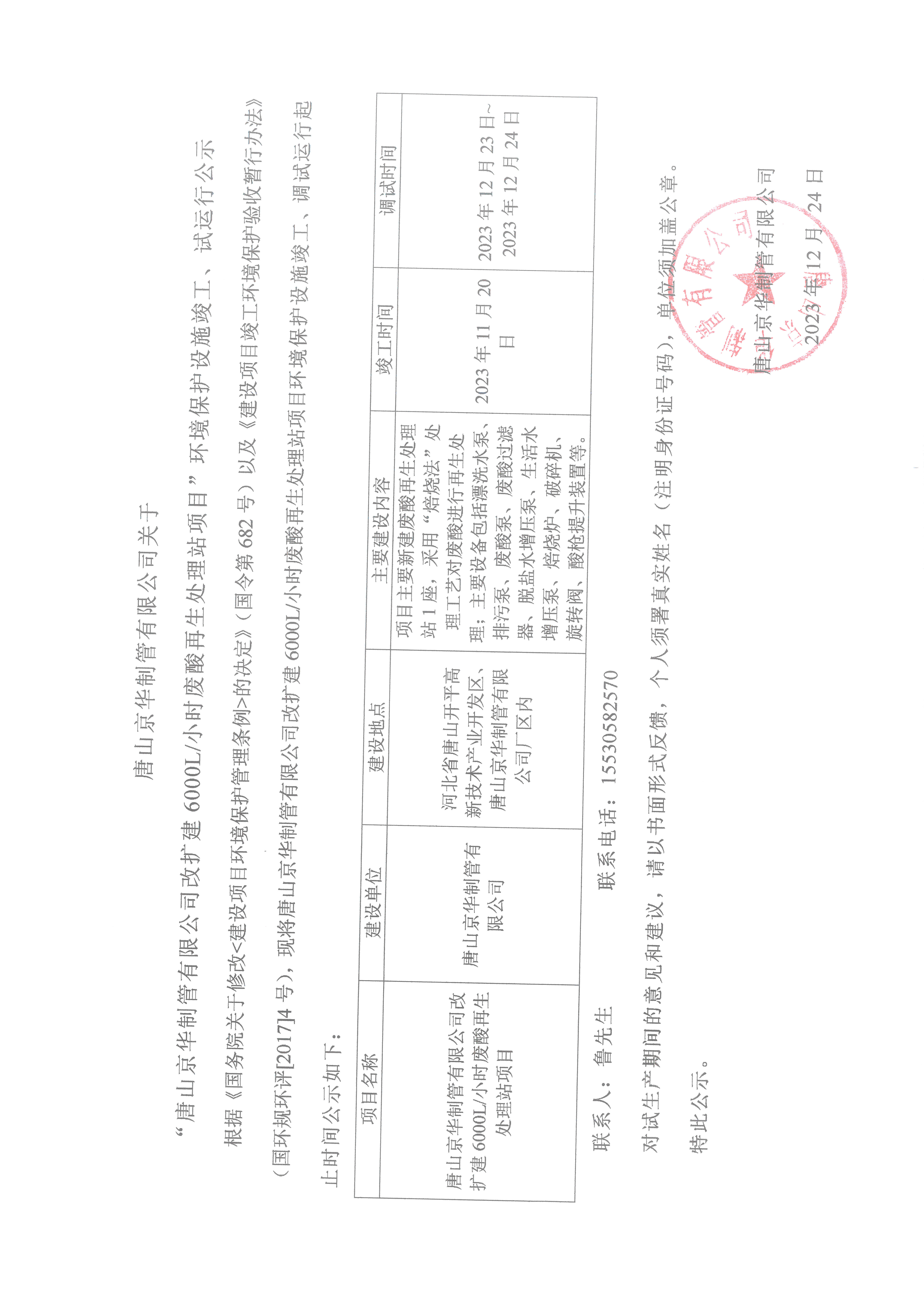 唐山京華制管有限公司關(guān)于“唐山京華制管有限公司改擴(kuò)建6000L每小時(shí)廢酸再生處理站項(xiàng)目”環(huán)境保護(hù)設(shè)施竣工、試運(yùn)行公示