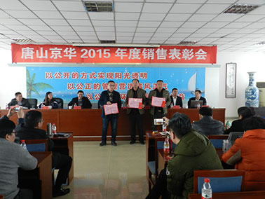 新年伊始,萬象更新!猴年正月十八,唐山京華召開了2015年度銷售表彰大會(huì),會(huì)議由銷售部吳紅濤部長主持,公司各部門領(lǐng)導(dǎo)、各區(qū)域駐外業(yè)務(wù)經(jīng)理及銷售內(nèi)部服務(wù)人員參加。會(huì)議在歡樂的氛圍中進(jìn)行!從市場開發(fā)、服務(wù)質(zhì)量以及新產(chǎn)品銷售等方面共評(píng)選出11名先進(jìn)標(biāo)兵,并頒發(fā)榮譽(yù)證書。鼓勵(lì)大家2016年再接再厲,再創(chuàng)輝煌!供銷副總胡武、銷售部長吳紅濤對(duì)2015年公司整體銷售情況進(jìn)行了總結(jié)分析,并對(duì)2016年的銷售任務(wù)做出了安排。