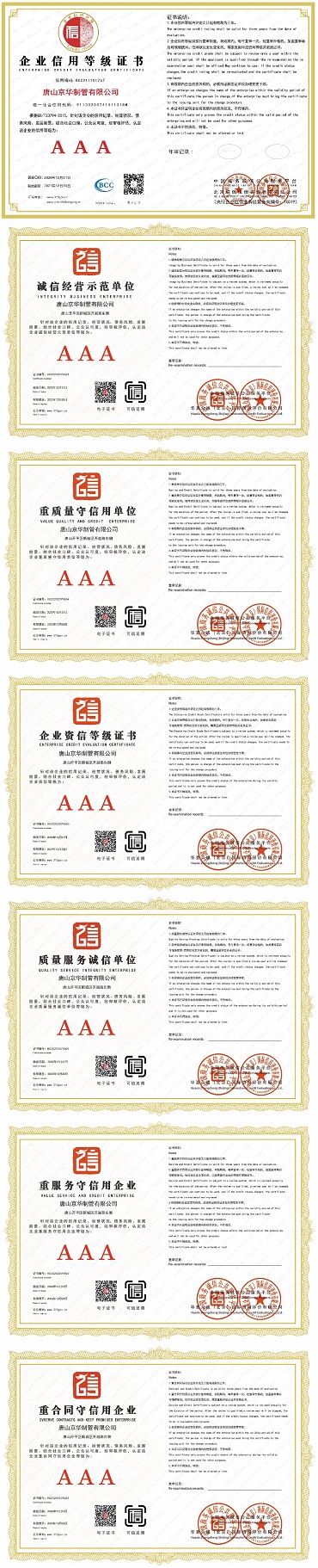 根據(jù)企業(yè)信用記錄、經(jīng)營狀況、債務風險、發(fā)展前景、結(jié)合社會口碑、公眾認可度,經(jīng)過審核評估,唐山京華制管有限公司被認定為“AAA級企業(yè)資信等級”、“AAA級企業(yè)信用等級”、“AAA級誠信經(jīng)營示范單位”、“AAA級質(zhì)量服務誠信單位”、“AAA級重服務守信用企業(yè)”、“AAA級重質(zhì)量守信用單位”、“AAA級重合同守信用企業(yè)”。